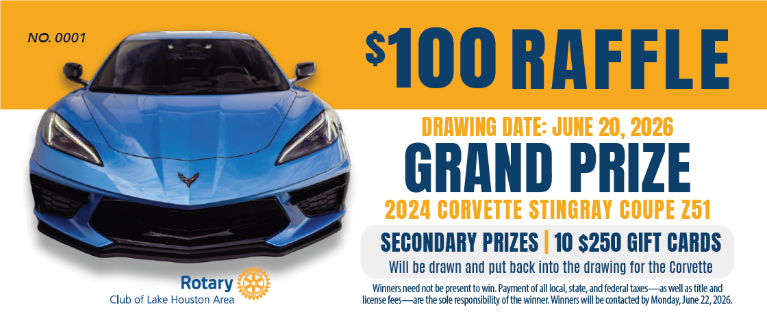 By entering the raffle winners acknowledge and give consent to the use of photographic or electronic reproductions of his or her image or likeness, voice and name for promotional and other purposes. No cash refunds. Prizes are not redeemable for cash value from the Rotary Club of Lake Houston Area, Lake Houston Rotary Foundation, Robbins Chevrolet or any associated vendor thereof. Only ONE (1) name may be listed on each ticket and ONE (1) winner will be chosen for each prize. To be eligible for any prize, the holder must be EIGHTEEN (18) years of age or older; and to be eligible for the GRAND PRIZE, holder must possess a valid U.S. driver’s license. Grand Prize winner will be responsible for titling and insuring the vehicle in his or her name, and for payment of all taxes, title registration, and any other fees that may apply.